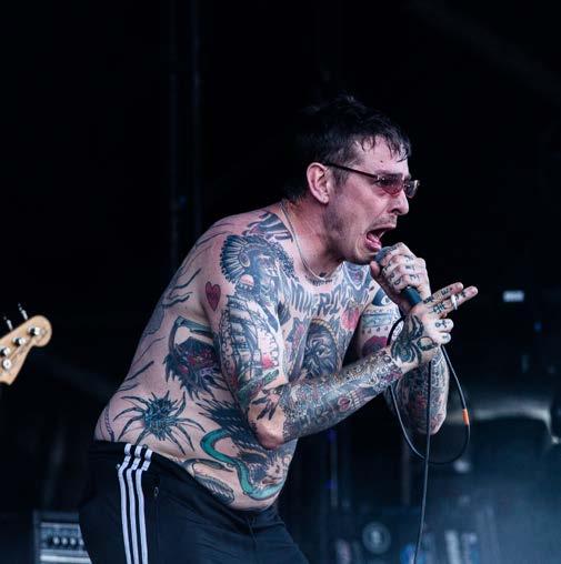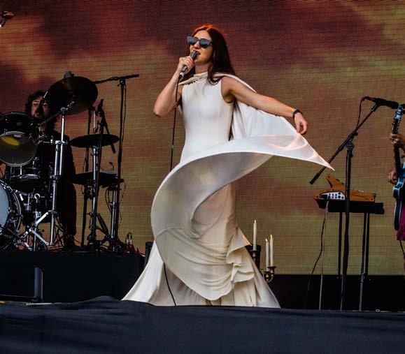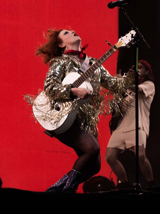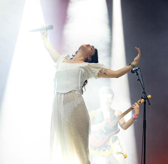 Over on the Woodsies stage, Rina Sawayama did not come here to play. From the moment a backing video flickers on, showing a young girl slowly morphing into the singer herself before dropping into ‘Hold The Girl’, it’s evident that Rina has got a true show up her sleeve and the next hour acts as a completely nextlevel justification of .why she should be in pop’s true top tier. Split into sections complete with atmospheric lighting changes, costume changes and a visceral sense of drama, Rina is on razor-sharp form. Halfway through, it becomes even more clear why there’s a palpable electricity to her performance, as she overtly calls out Matty Healy by dedicating ‘STFU!’ to “a white man who watches Ghetto Gaggers and mocks Asian people on a podcast. He also owns my masters. I’ve had enough”. It’s a powerful move in a set that roars with intensity and polish throughout.