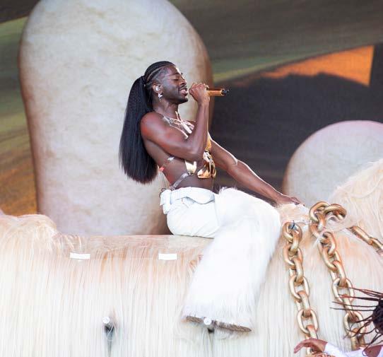 that you’d hope from one of music’s most culturally game-changing stars. From the angle of pure, stadiumsized entertainment, he’s decided to bring a zoo’s worth of enormous Lion King-style silver animals with him; throughout the set, we get introduced to a snake, an emu, a massive horse for ‘Old Town Road’ and, most bizarrely, a man in a minotaur outfit that quietly follows him around the stage. More than that, however, his is a proudly queer show that takes hold of its enormous platform and uses it to the full, with Nas and one of his all-male backing dancers sharing an on-stage kiss, alongside a set of choreography that brings in Vogueing and generally wears its sexual freedom loud and proud.