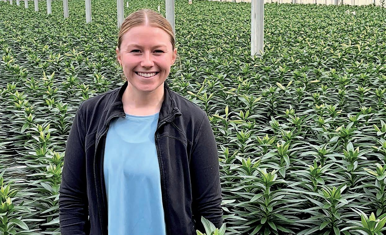 Bridget Bergen is production manager at Bergen’s Greenhouses. She is standing among the Easter lilies growing in mid-March, 2023. Nathan Bowe / Spring Home