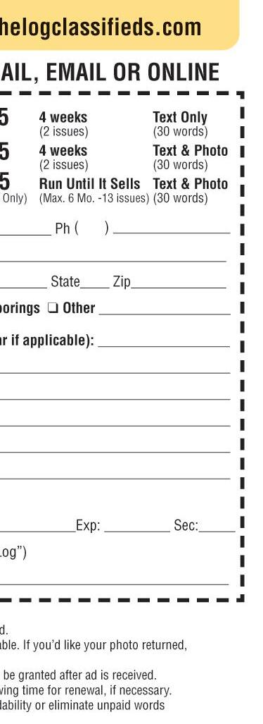Youcanplaceyour Log classifiedadbycalling 800-887-1615,emailing classifieds@thelog.com, ordirectlyonlineat www.thelogclassifieds.com