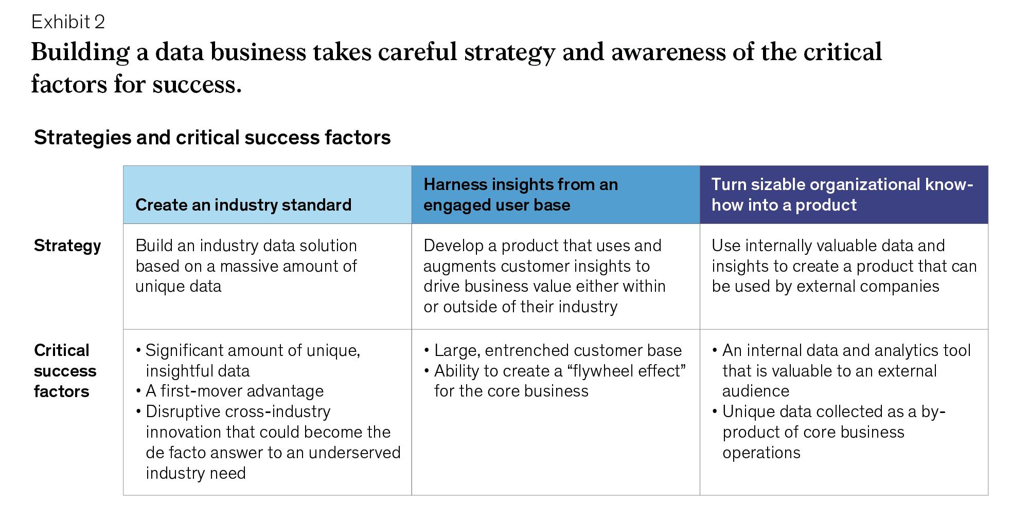 pursue three broad strategies for building such data sets, each with a different value proposition and critical success factors: Create an industry standard: Typically, these data businesses start as data aggregators, assembling a massive amount of unique data. Some can reach a tipping point when a network effect scales the utility of their product until it eventually surpasses alternative offerings and becomes an industry standard. This can be a very effective strategy. Consider Reddit’s $60 million annual deal enabling Google to train its AI models on its data. But it’s also one of the most difficult business models to pursue. Once the market leaders become established as a de facto standard, it is increasingly difficult for new entrants to compete. Succeeding here requires an asymmetric advantage in data access, a first-mover edge, or both. One financial-services firm has