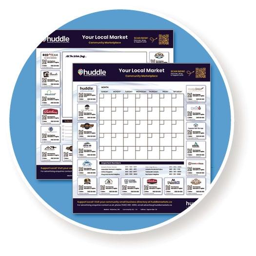 huddle’s standout feature is its 11” x 12” Community Dry-Erase Planner distributed in partnership with Canada Post, free of charge to thousands of residences every four months. Tailored to each community, these planners serve as practical organizers while showcasing profile ads for 32 local businesses, each exclusive in their category, and features a unique QR code that links consumers directly to their online huddle profile.