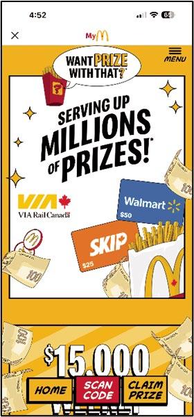 they’ve won or manually enter it. The contest runs from February 4th to March 3rd, aiming to drive app adoption, usage and increase frequency and spend. According to the contest’s advertising, there are $15,000 weekly cash prizes. Additional prizes include trips for two with Via Rail, $25 SKIP gift cards, $50 Walmart gift cards, one-year subscriptions to Paramount+, up to 10,000 My McDonald’s Rewards points, and several free menu items. McDonald’s has also integrated its loyalty program with the contest, so each code scan tracks whether a customer has won and indicates how close they are to earning 2,000 My McDonald’s Rewards points with each peel-off scan. The 2,000 points is awarded after 5 peel-off code scans. This “progressto-reward” mechanism is a proven and effective neuroscience strategy that motivates customers to visit McDonald’s more often to reach a reward worth 2,000 points.