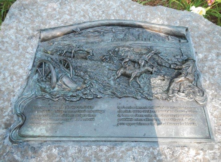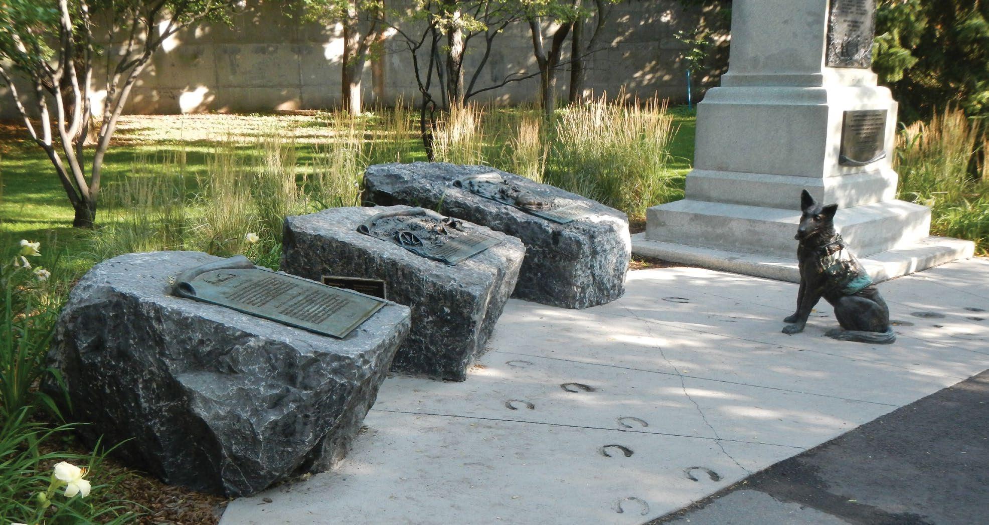 The Animals in War Dedication honours animals that served alongside their human comrades in war. It is symbolically set next to the South African War Memorial, a battle for which Canada supplied 50,000 horses for mounted troops. Both commemorations are located in Confederation Park in downtown Ottawa. The footprints of dogs, horses and mules are stamped into the concrete of the Animals in War Dedication, representing the marks they left on the battlefield. Three bronze plaques depict animals in war and provide interesting facts about their roles, their sacrifices, and their unwavering loyalty. Among the roles animals have played in war:
