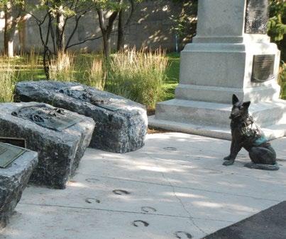 This memorial includes three plaques and a statue, as well as animal footprints in the cement. For centuries, animals have demonstrated an enduring partnership with humans during times of war. They have served as means of transportation, beast of burden, messengers, protectors and mascots. Still today, dogs use their unique, sharply tuned instincts to detect mine clusters, and conduct search and rescue operations. We remember the contribution and sacrifice of all animals.