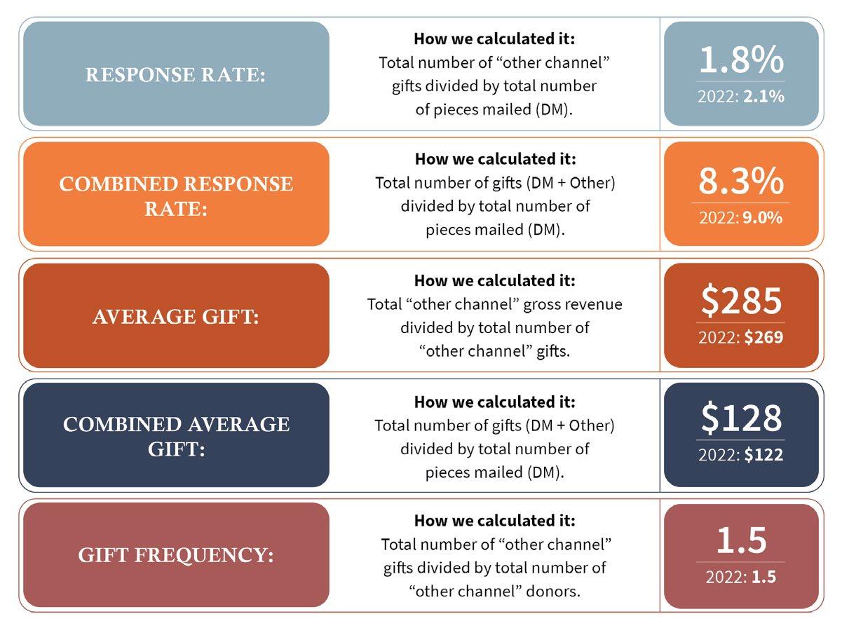A total of 49 charities provided us with direct mail results from 2022 and 2023, including total revenue, total costs, number of donors, number of gifts, and more.