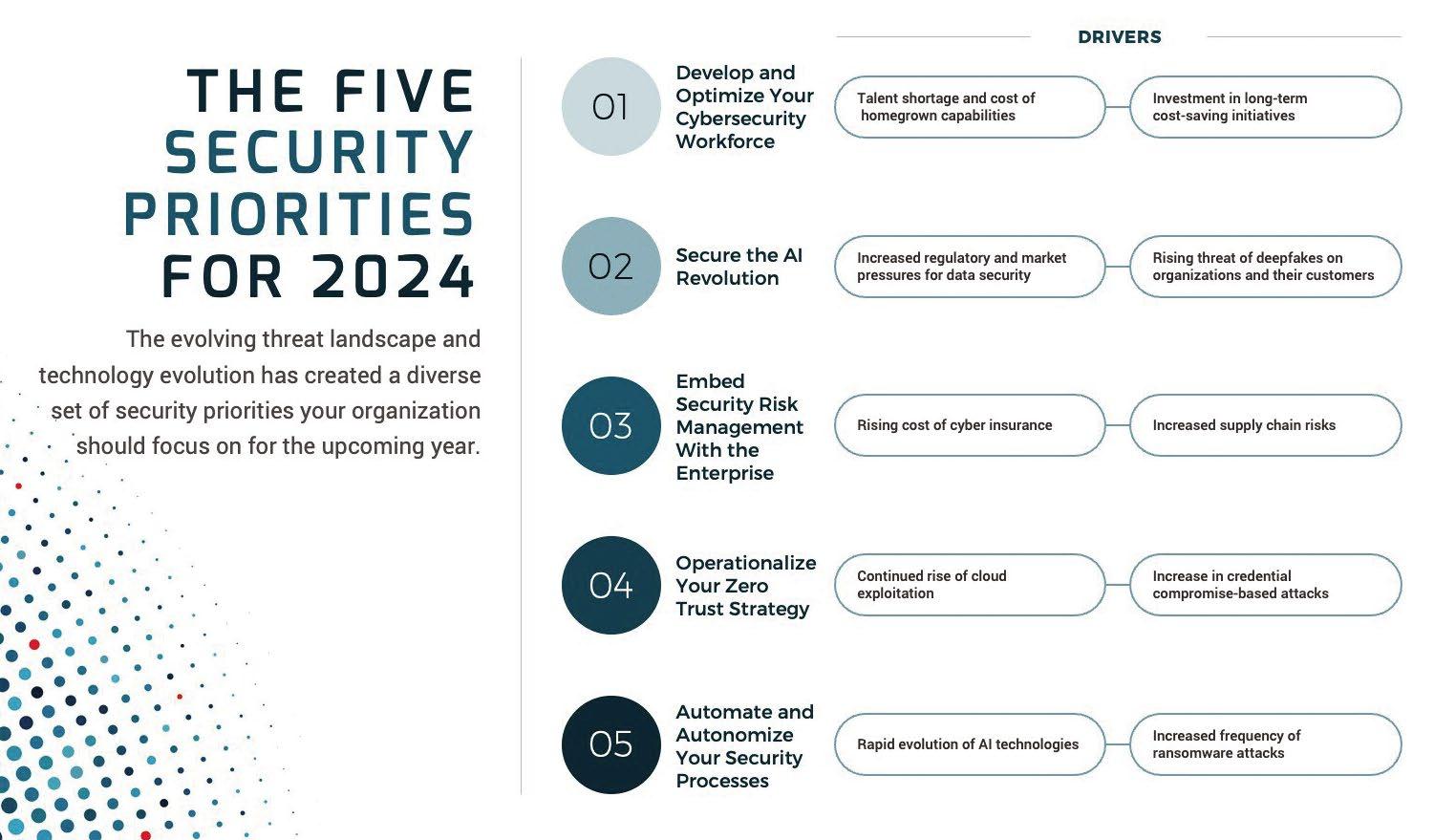 Leveraging the firm’s research findings and data, the Security Priorities 2024 report outlines the following five highpriority initiatives security leaders, and their organizations, should implement to confidently address security risks for 2024 and the years to come:
