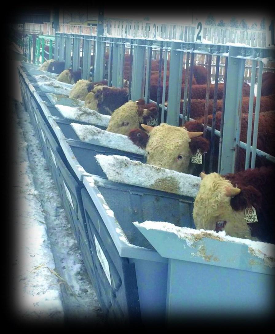 In 2011 we sent our first bulls off to Olds College to participate in the Residual Feed Intake research trials. The NSERC (Natural Sciences and Research Council)funded project was competed with the cooperation of the University of Alberta, Olds College and Cattleland Feedyards. RFI is a measure of the variation in feed intake that remains after the requirements for maintenance and growth have been met. Efficient animals eat less than expected and have a negative or low RFI, while inefficient animals eat more than expected and have a positive or high RFI. RFI has good heritability at 0.36 (36%) and little influence or correlation with other traits. Research has shown that selecting for RFI may result in as much as a 9-10% reduction in cowherd maintenance costs, a 10-12% reduction in feed intake, a 25-30% decrease in methane emissions and a 15-20% decrease in manure production. Following the research trials in 2015, Richardson Ranch and other interested Hereford breeders have continued to collect Feed Efficiency Data at Olds College every year. This past winter bulls enter pens equipped with GrowSafe feeders on November 28th. After their 21 day warm up period the 50 day RFI test started on Dec 19, 2022 with final end of test weigh scheduled for Feb 8, 2023. Data collected includes feed consumption, weight, hip height and ultrasound results for backfat thickness, ribeye area and marbling score. After final measurements, data is submitted and EPDs generated.