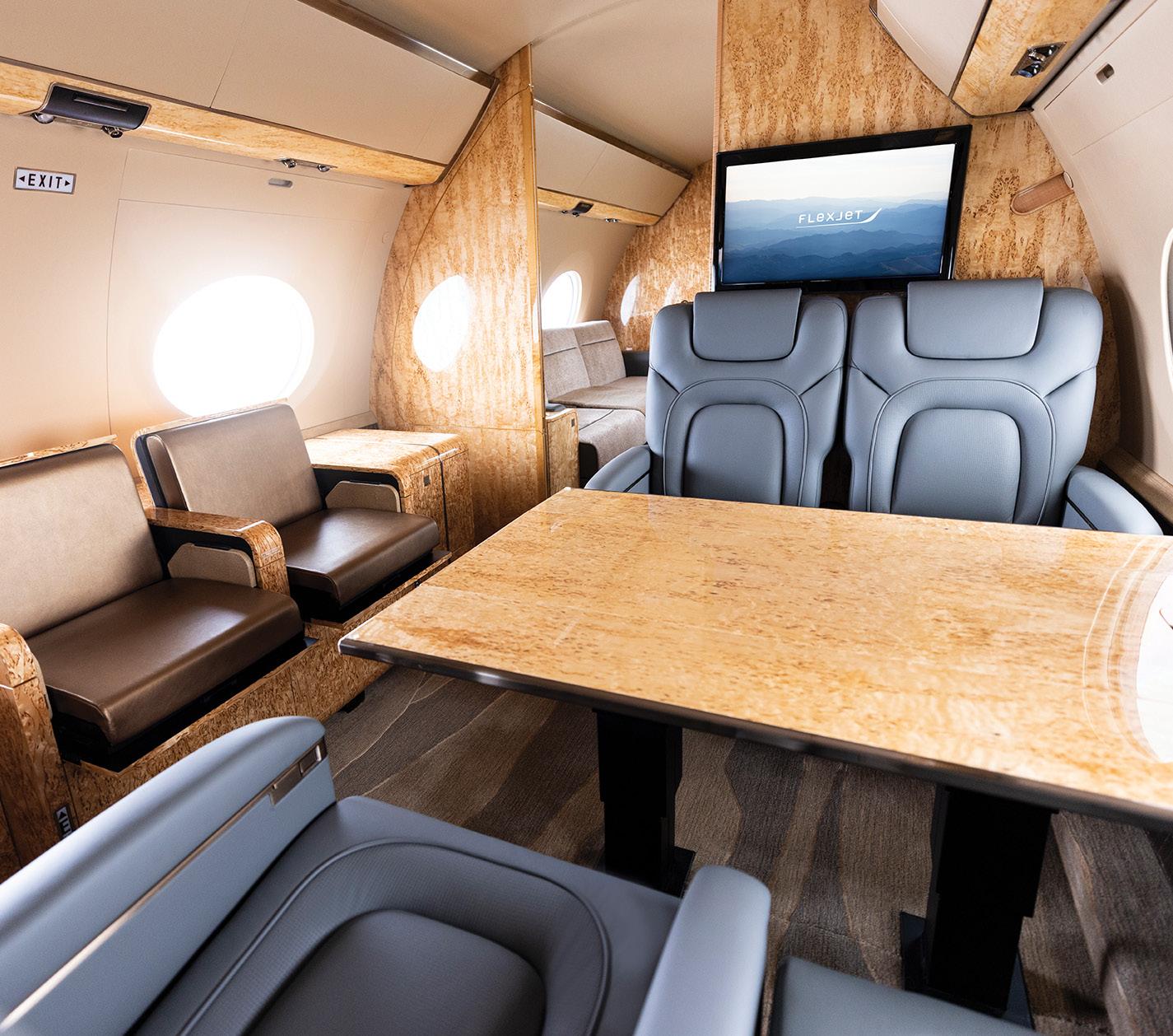 Le confort de la cabine vous fera regretter que le vol ne soit pas plus long. Avec une largeur de cabine de 2,49 m, soit la largeur maximale de sa classe, le Gulfstream G650 peut accueillir confortablement jusqu’à quinze passagers. Aménagé par Flexjet, le Gulfstream G650 offre une cabine divisée en plusieurs espaces distincts pour que les passagers puissent travailler, dîner, se détendre et dormir.