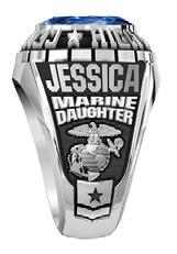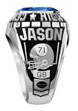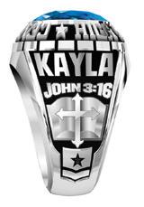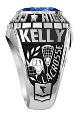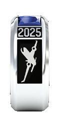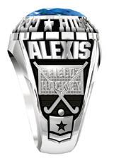Shown in White Lustrium ® with Dark Blue Translucent Stone Varsity Center.