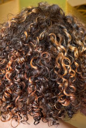 When color blocking or creating an ombre effect, use either zig-zag sections or diagonal sections that are slightly offset. By avoiding strong horizontal and vertical lines, you will avoid “chunks” of color throughout the head. Curls tend to clump together, making sections of color appear bolder than intended.