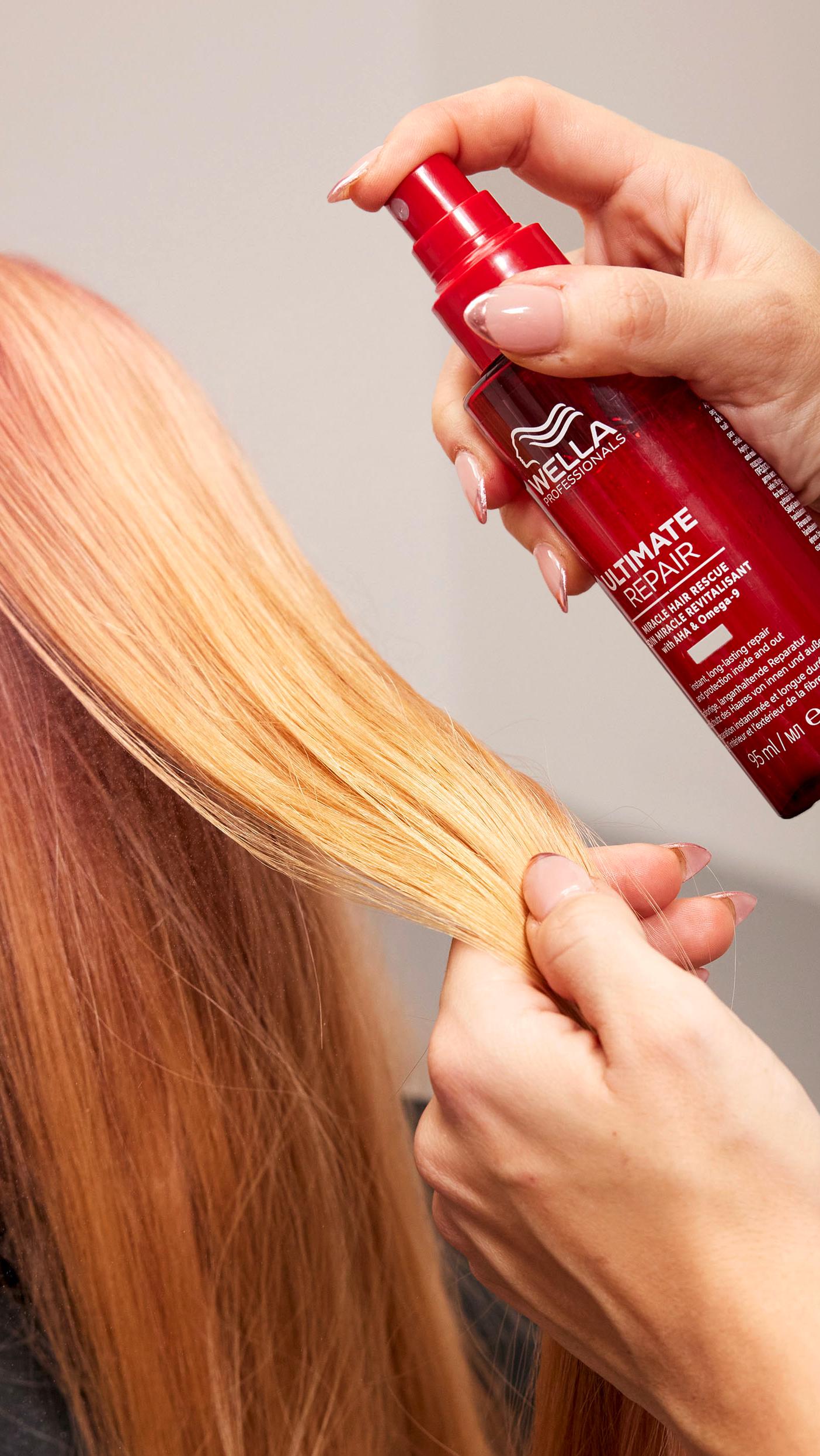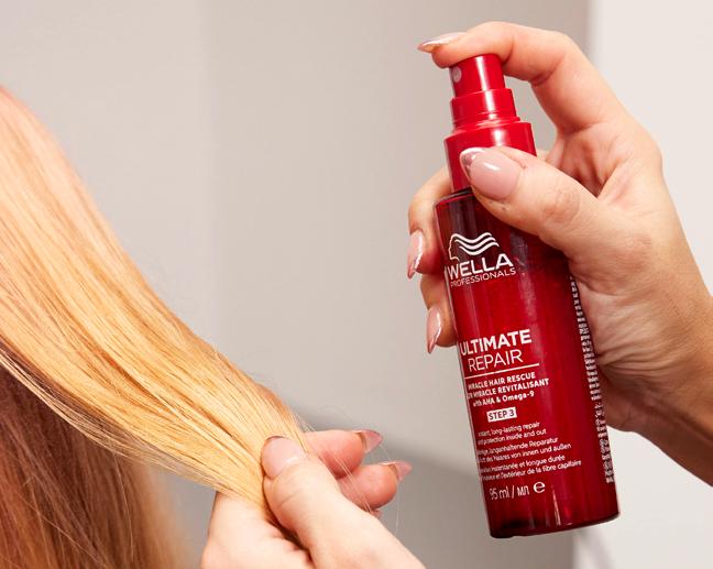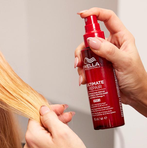 Use Ultimate Repair line to repair the hair from the inside out. With AHA rebuild bonds inside & Omega-9 to replenish hair outside.