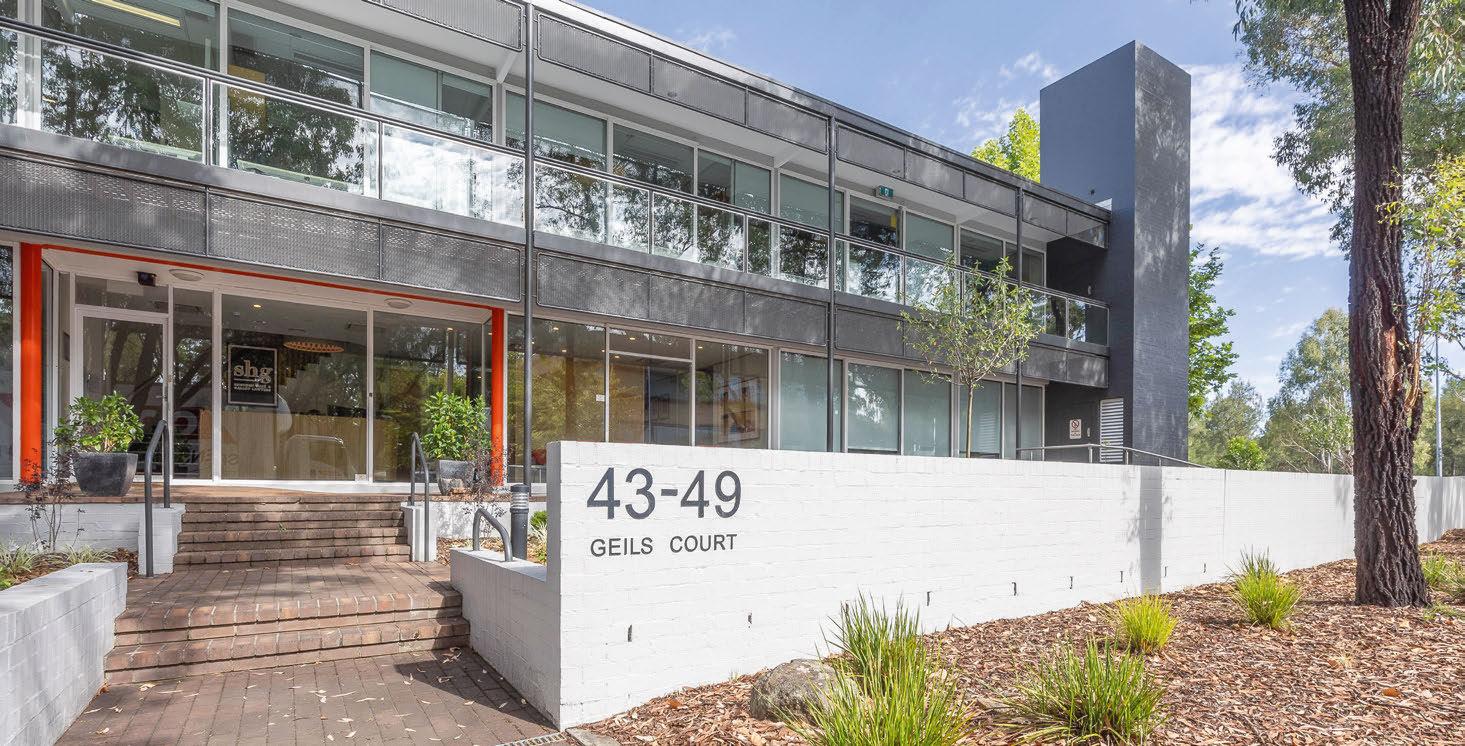 The building is on more than 2000 square metres at the corner of Geils Court and Denison Street, and set among thoughtfully landscaped gardens and courtyards.
