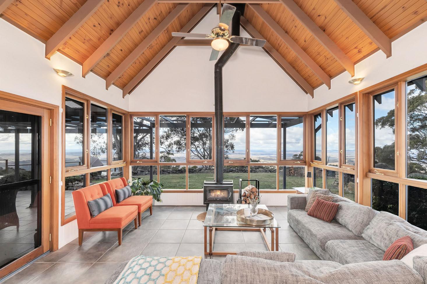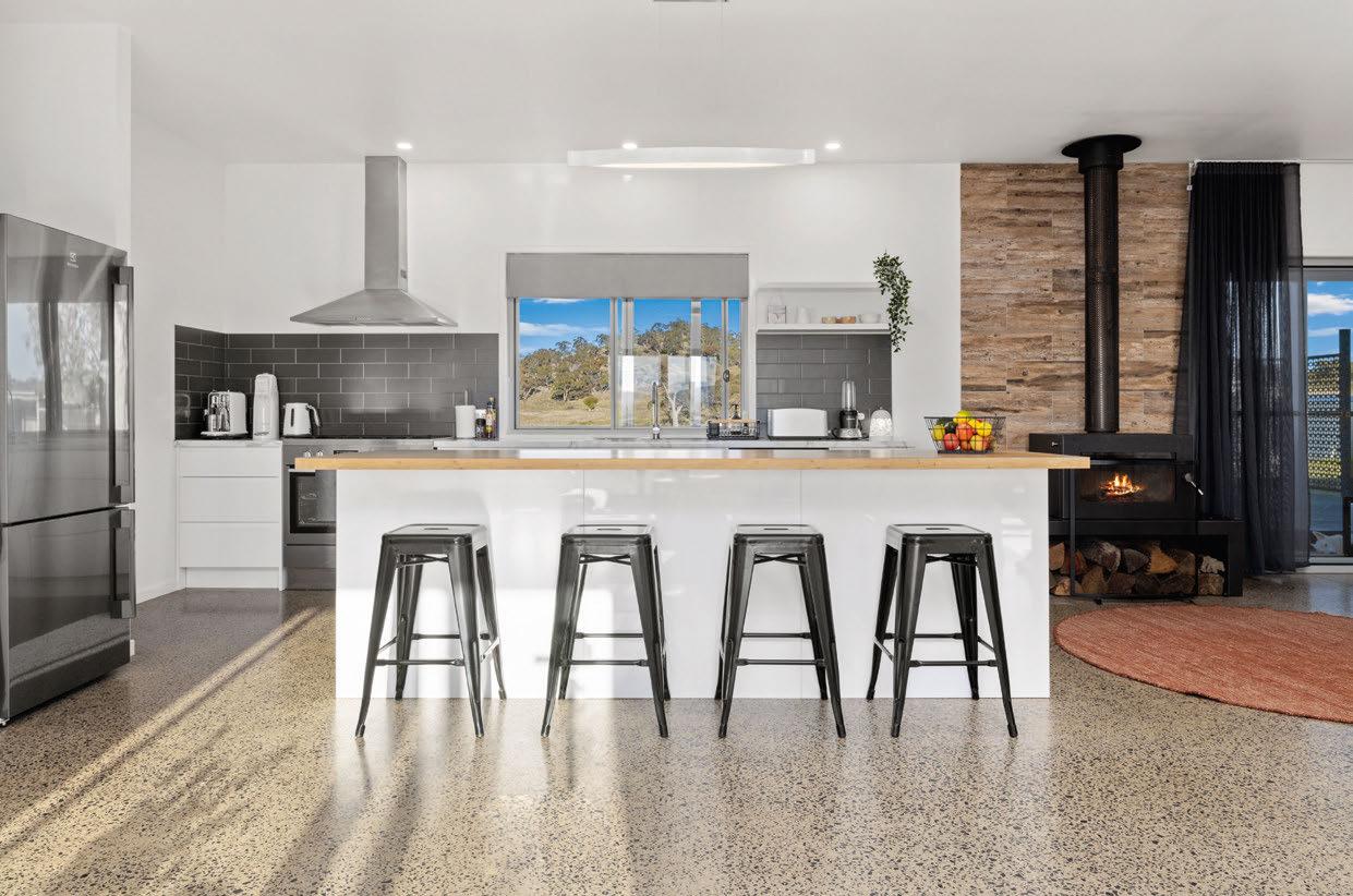 This family home is on 40.5 hectares with mountain views and boasts five bedrooms and open-plan living areas with a feature fireplace and dream kitchen. The wraparound verandah is home to a built-in hot tub, perfect after a day on the slopes. There’s also a fully self-contained tiny home, perhaps for guests or extra income during the season.