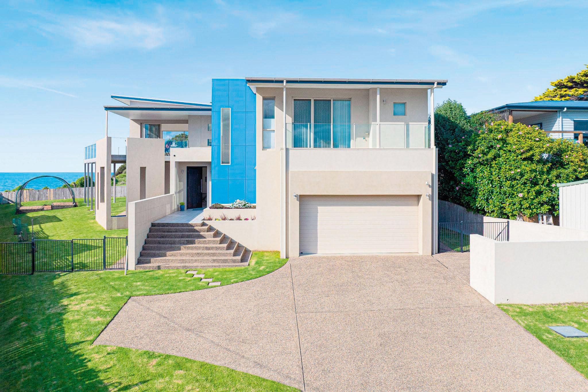 This incredible coastal retreat turns heads with its sleek facade. Inside, luxurious features unfold, from custom timber detailing to the designer kitchen. The upstairs living room opens to the main deck (there are four in total) with a built-in barbecue – perfect for entertaining or enjoying the serenity. There’s a self-contained area downstairs.