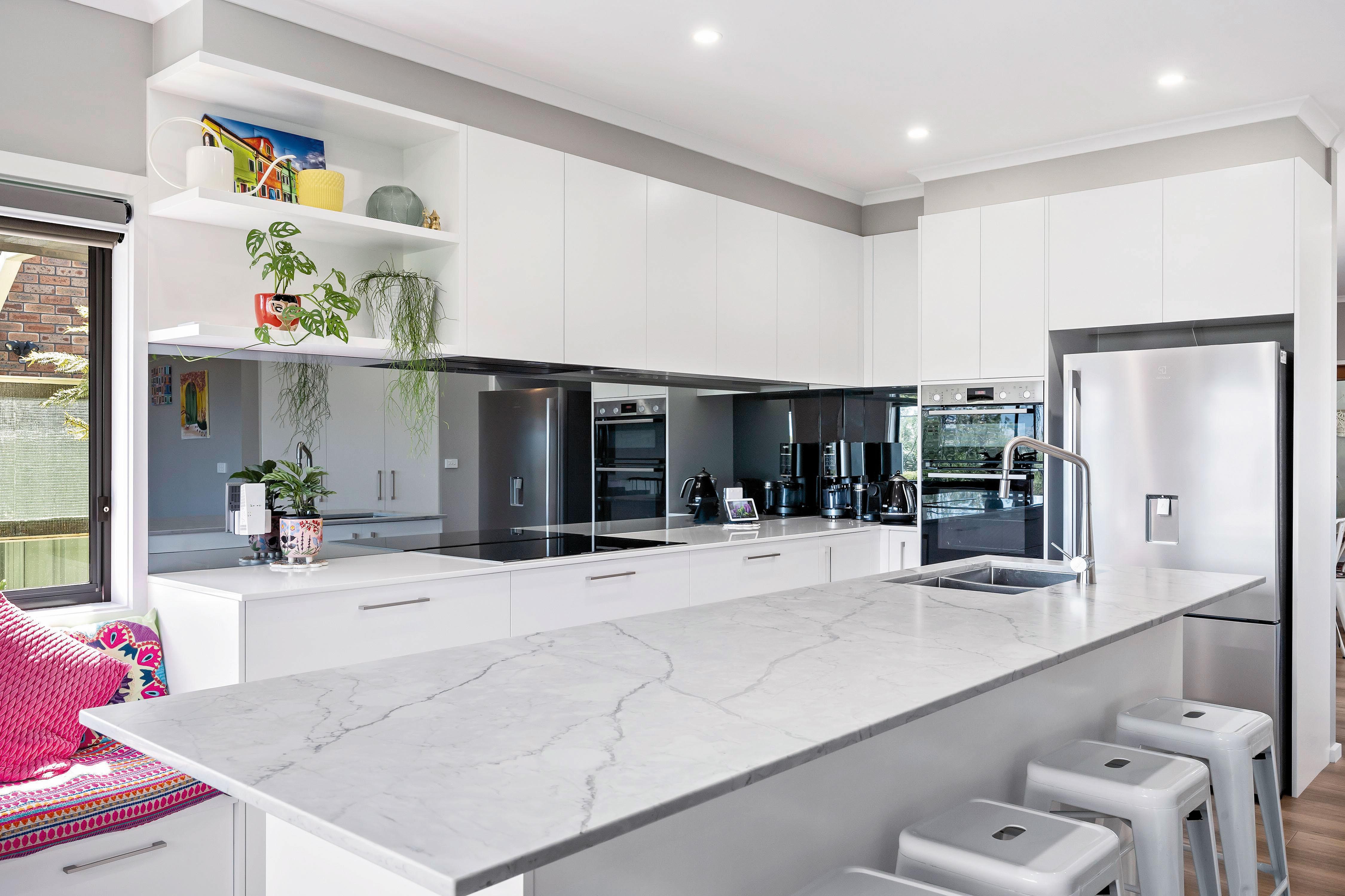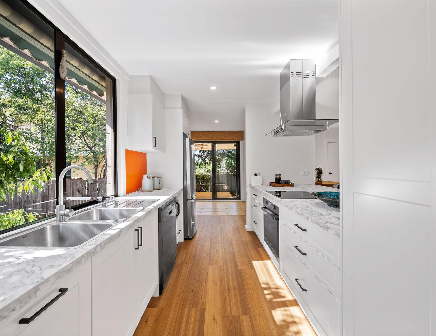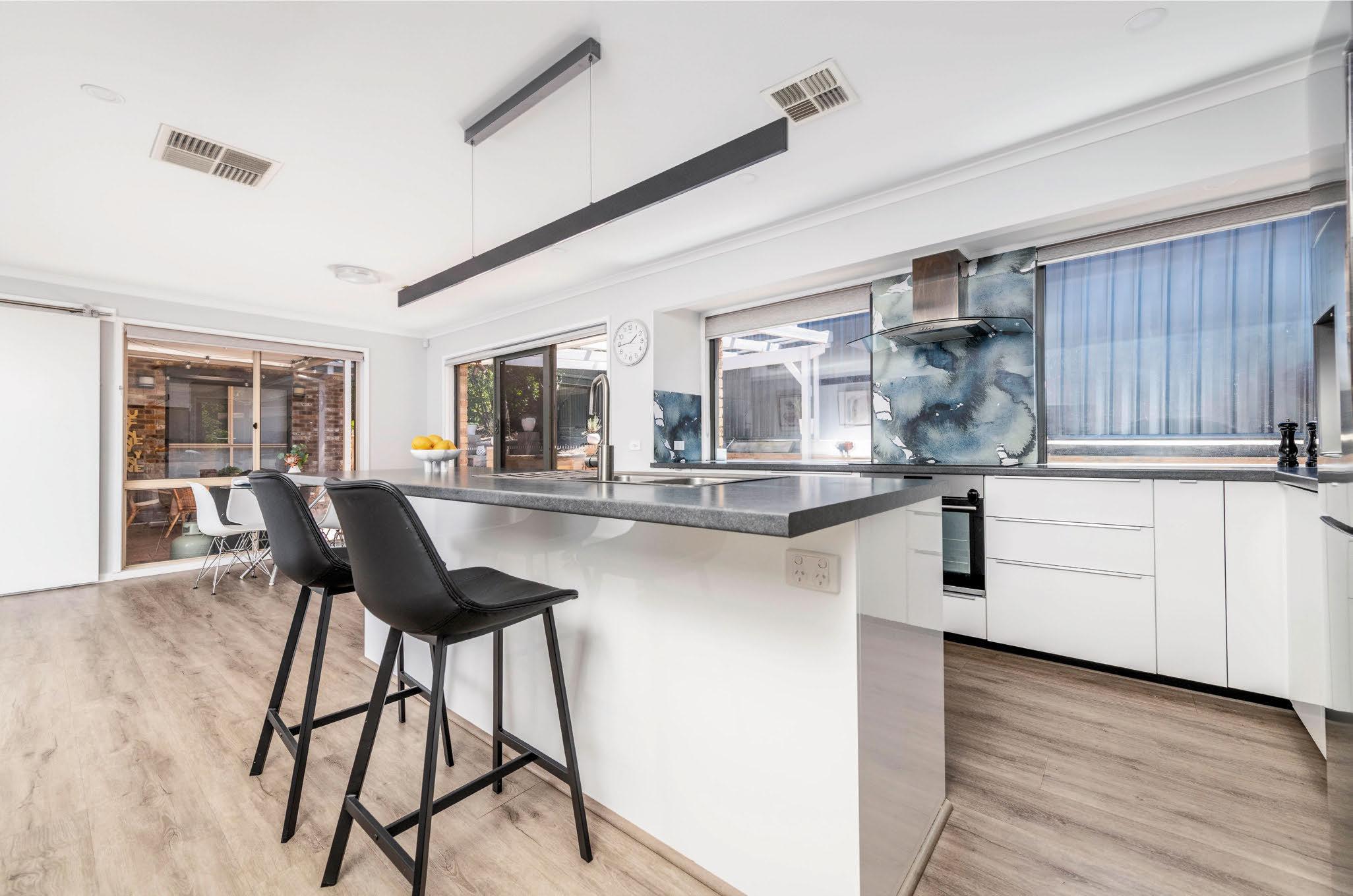 A delightful renovation has added flair and functionality to this three-bedroom duplex. The modern kitchen is a convenient gathering space, where large bifold doors flood the home with natural light. Draw them open to access the backyard and covered al fresco space. Other internal features include timber floors and a gas fireplace. “It’s one of those homes that, if you could pick it up and take it with you, you would,” the owners say.