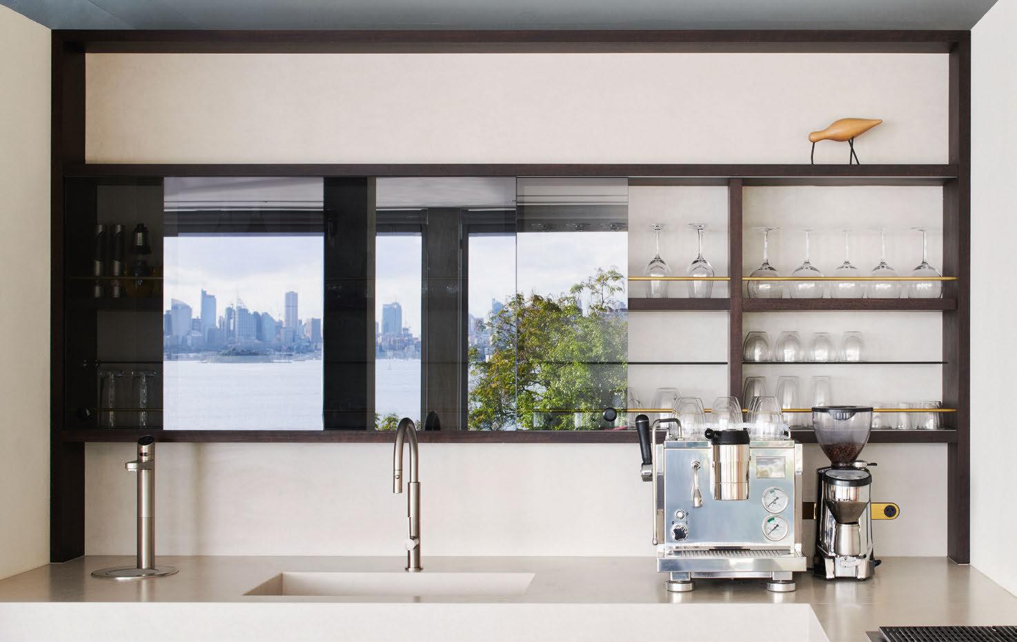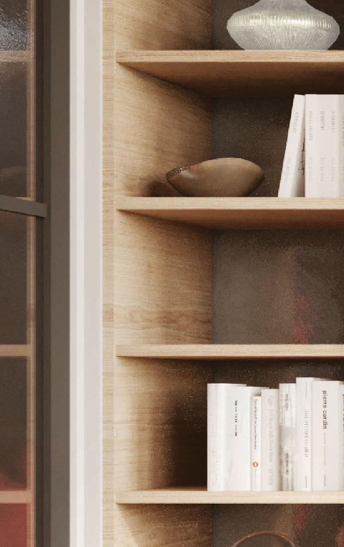 a multipurpose space, currently used as an art and craft studio. Next to this is a distinctive library and an office with stunning, richly-toned timber joinery.