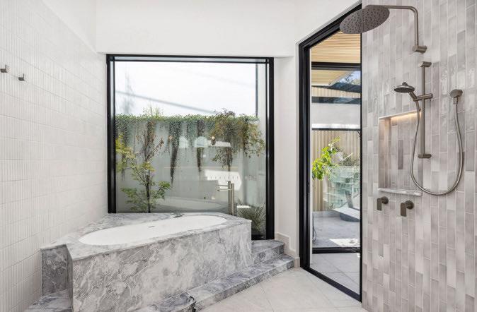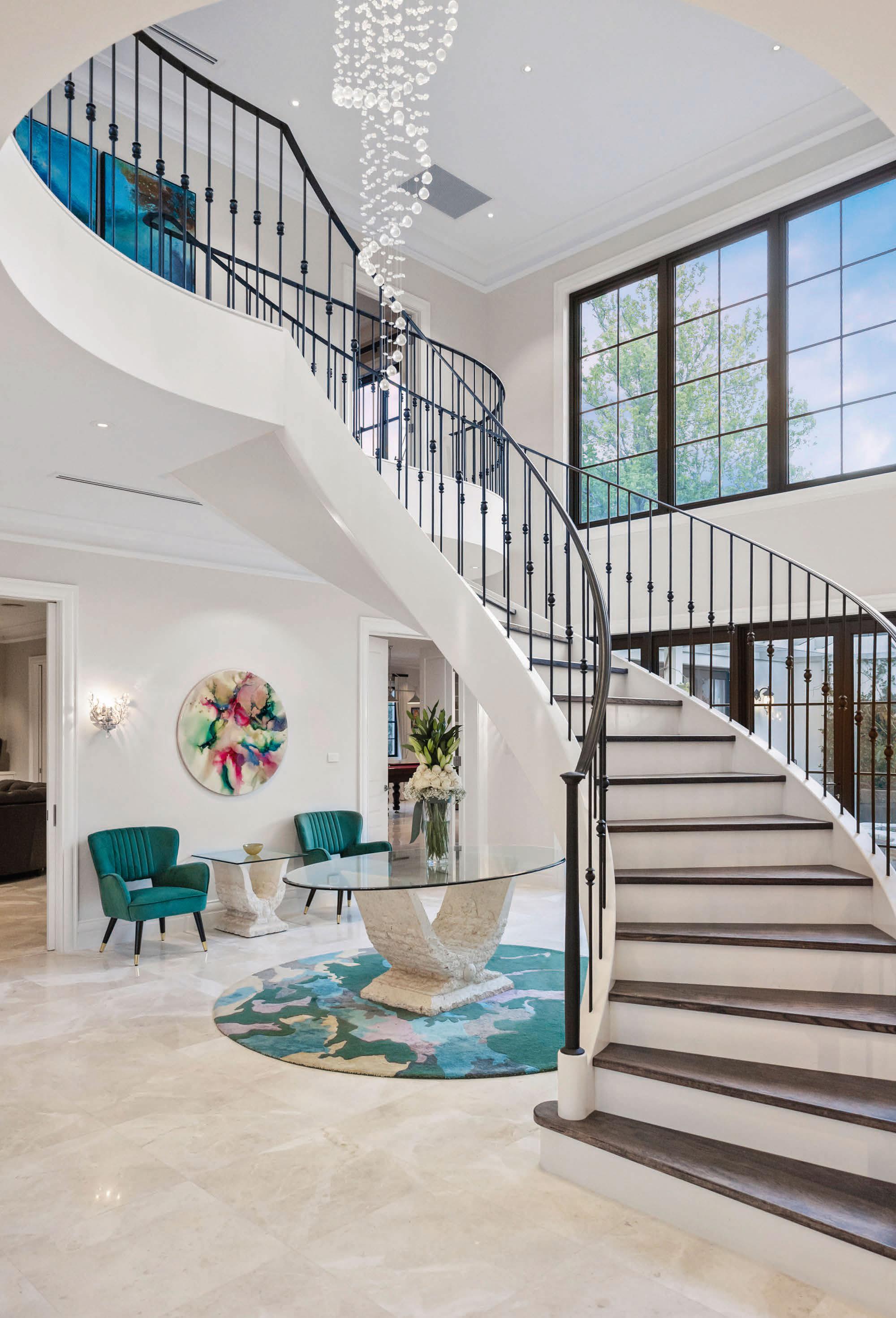 are design elements carried into the interiors. On arrival, an ornate blackand-white spiral staircase acts as a centrepiece in the marbled entrance hall. Crittall-style doors just beyond reveal a serene central courtyard with vineentwined pergolas and water features that create an enchanting ambience.