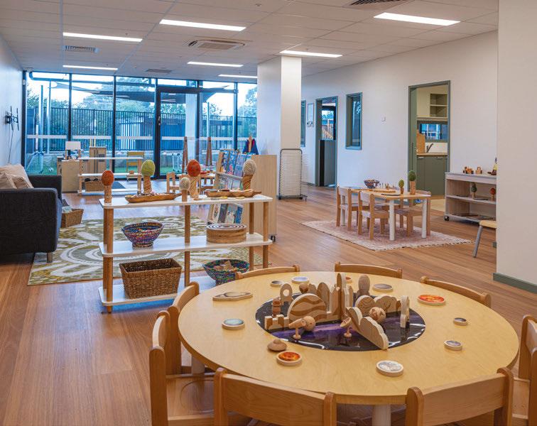 Outdoors, a 508-square-metre landscaped play area offers turf zones, sandpits, cubby houses and shaded spaces.