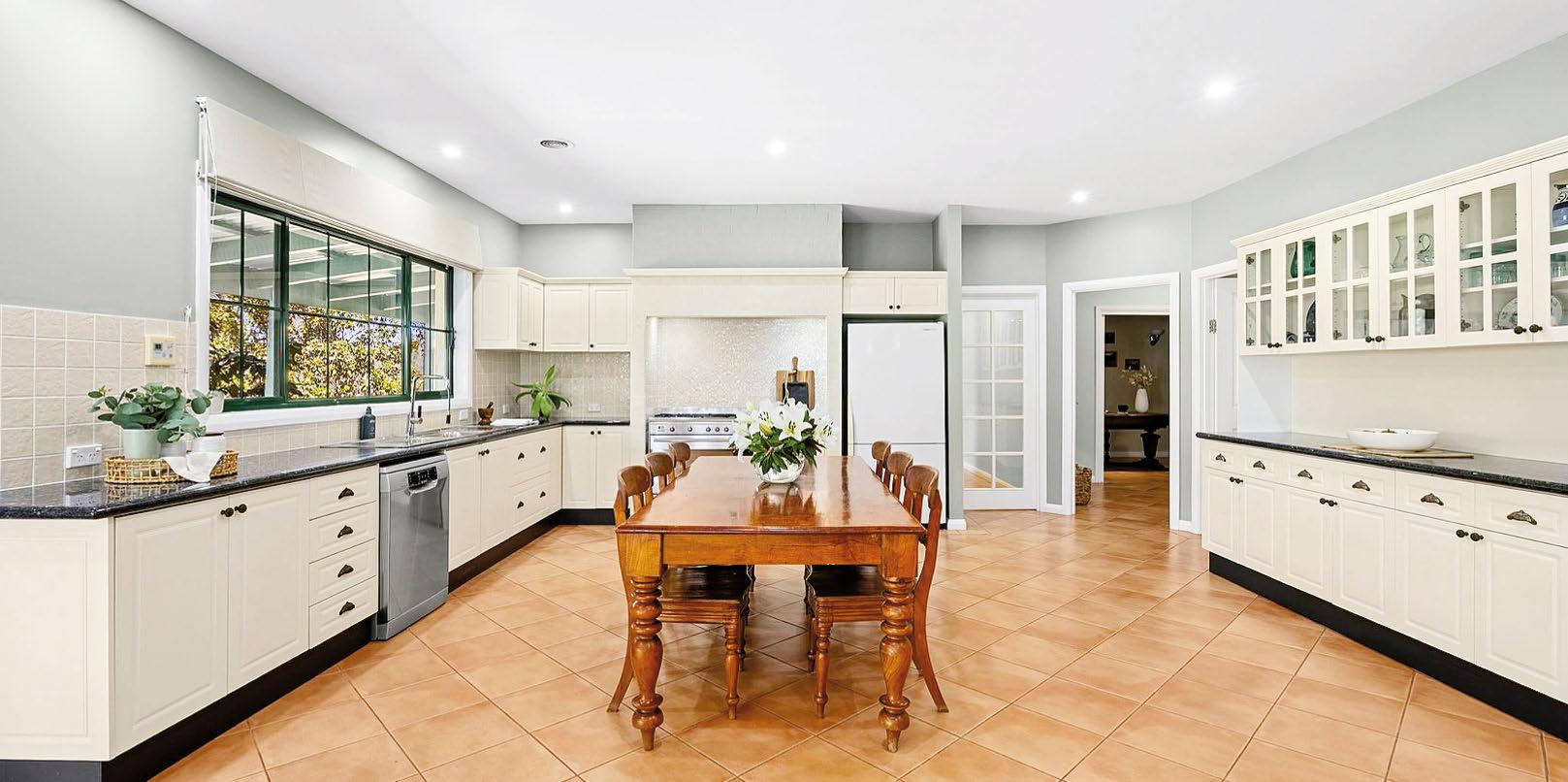 The kitchen boasts a country rustic aesthetic, with an informal meals space and direct access to the backyard.