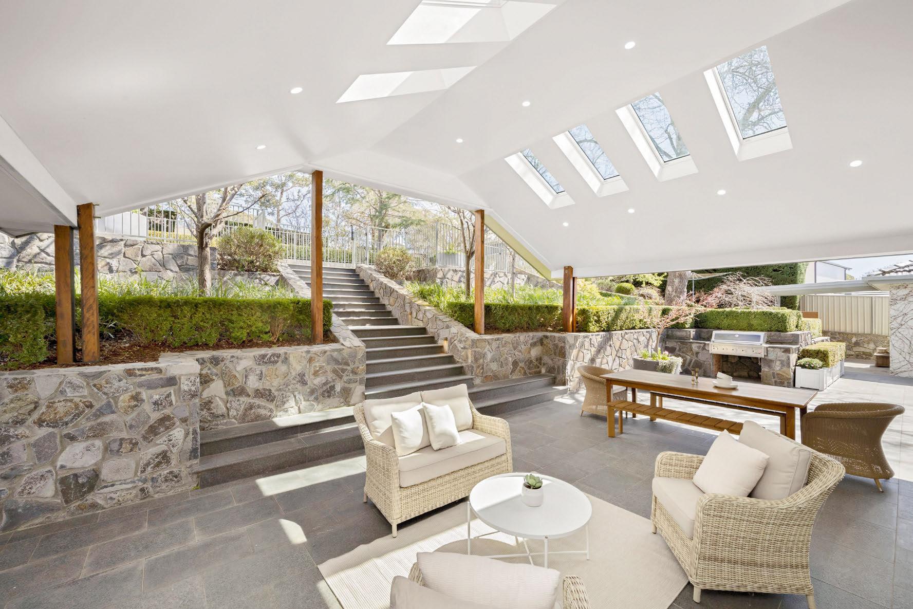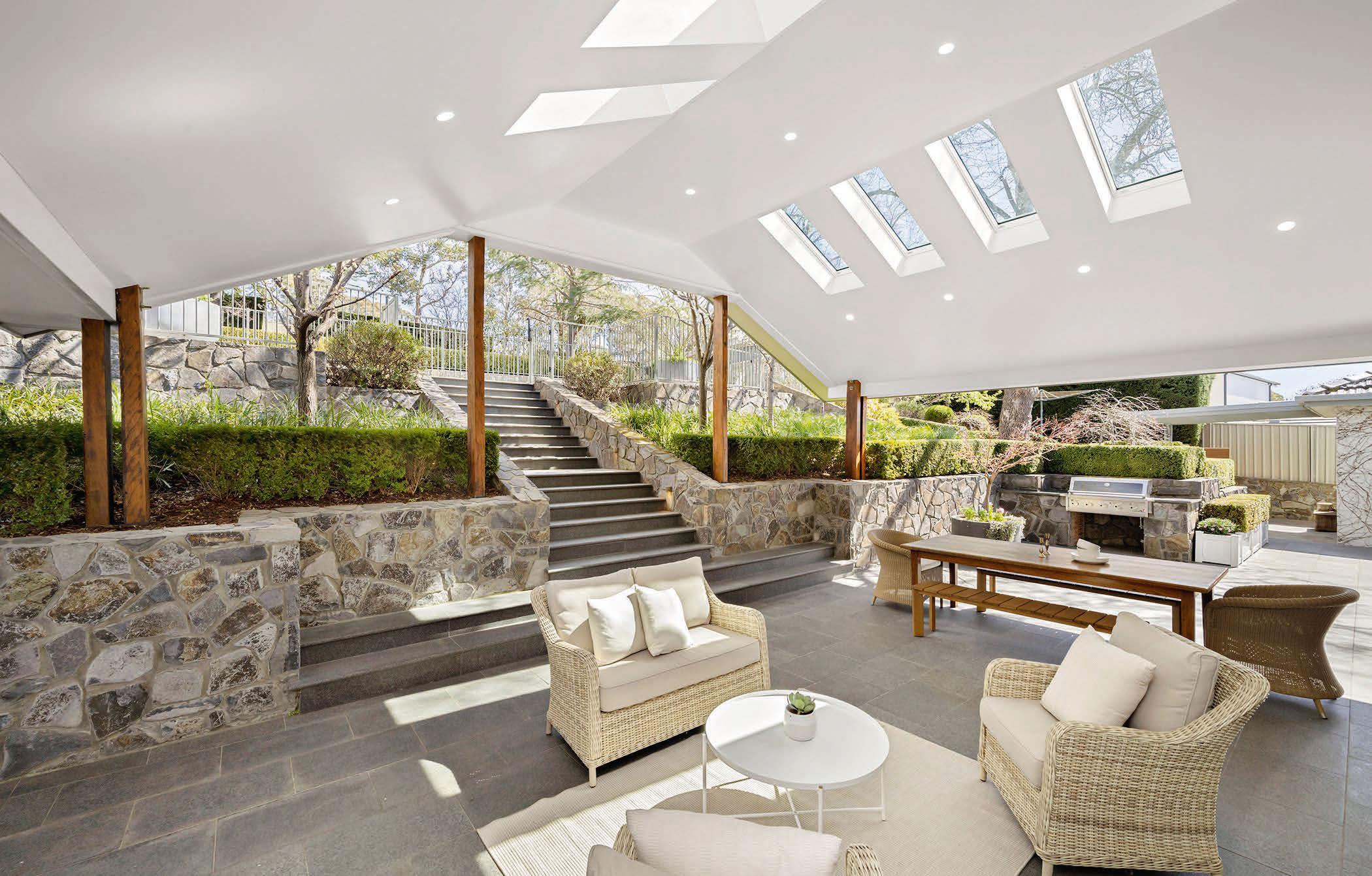 enclosed television, and manually opening roof-has become a favourite gathering place. The front covered deck, with sweeping views of the Brindabellas and motorised shutters to the sides, ensuring year-round comfort.