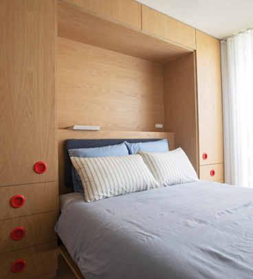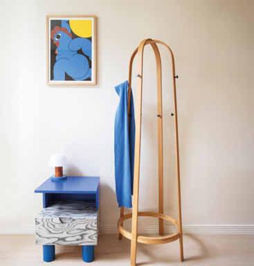 A bonus of being such a skilled maker is the ability to customise his and Vermeersch’s Brunswick West apartment in Melbourne’s inner north. The space had limited storage when the couple moved in, so Fritsche set about installing cabinetry with coral handles to match the custom shade of their Okay Goodnight bed. It’s flanked by bright blue Next to Bed Remix tables which add a fun contrast. “We wanted to make the place warm and inviting, and practical at the same time.”