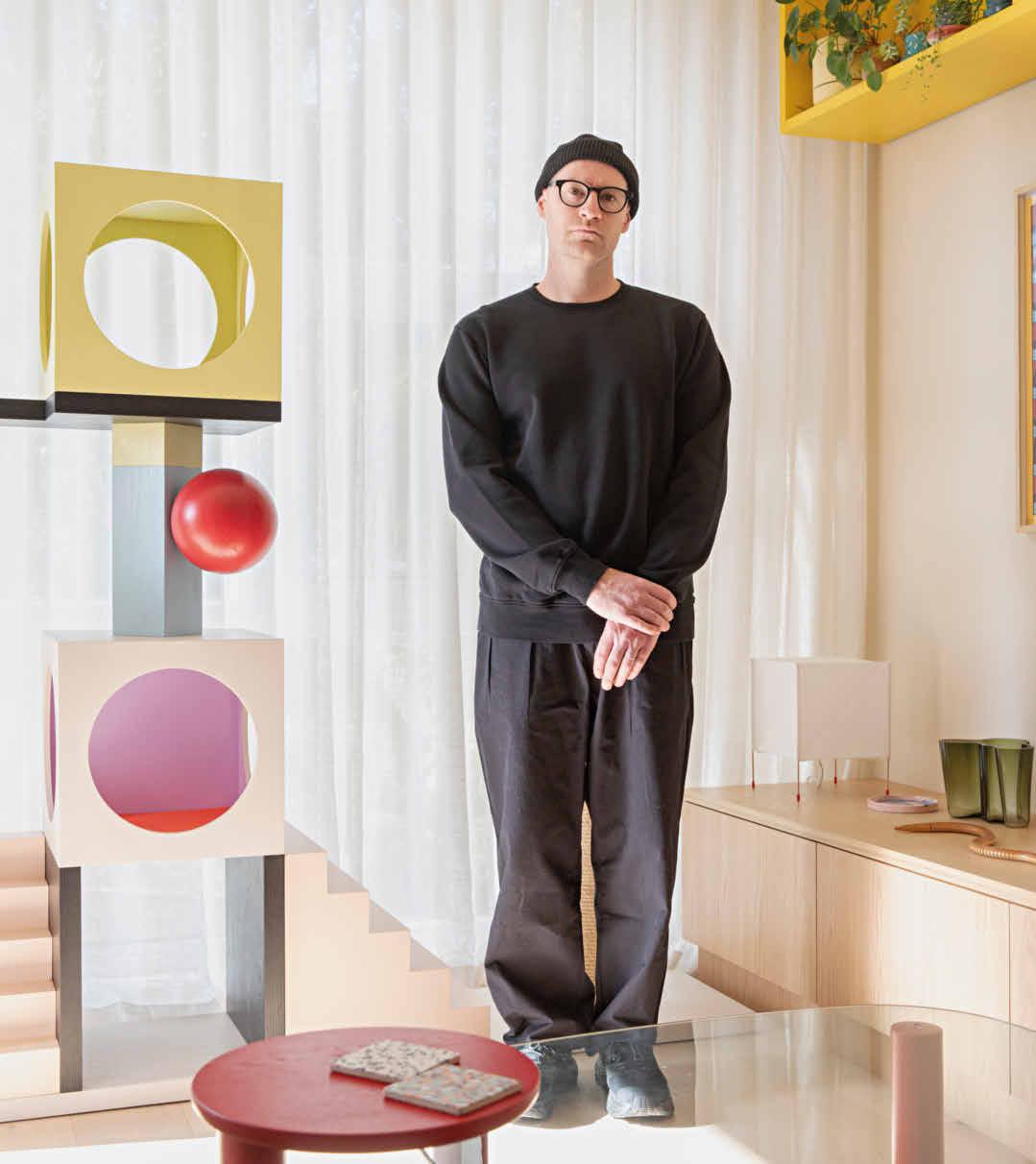 When we visit Dustin Fritsche at home he’s dressed in traditional Melbourne all-black garb. But his apartment and his furniture label Softer Studio are another story: playful, unexpected and unafraid of bold colour and pattern. Minimalist natural finishes sit neatly next to quirky Memphis-inspired shapes and shades – and there’s always room for cats.