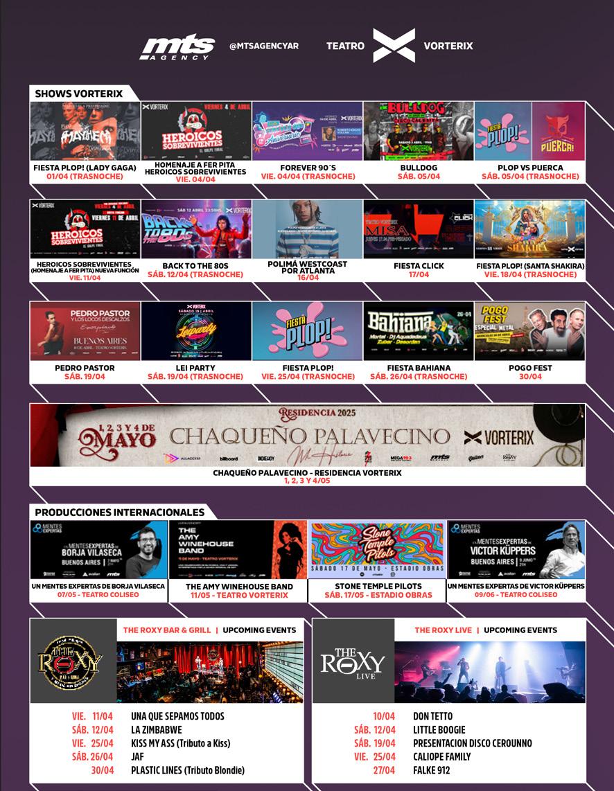 y Kevin Kaarl el 25 de octubre en Vorterix. La agenda de shows internacionales de la DF Entertainment tiene en abril a Akriila en Niceto y The Drive Era en el Movistar Arena. En mayo llegará el español Iñigo Quintero para presentarse el 9 en Niceto Club, NSQK el 13 en el mismo venue y Sticky MA el 17 en Uniclub. Taambién Hozier el 27 en Movistar Arena y St. Vincent con Kim Gordon el 29 en Obras. En el Auditorio Belgrano se presentará Ed Maerick el 31 de mayo. En lo que respecta a artistas nacionales, La K’onga tiene tres shows agotados en el Movsistar Arena el 21, 22 y 23 de abril,Paulo Londra dos fechas en el mismo venue en junio y Soledad sumó una fecha en el Teatro Gran Rex el 12 de octubre, luego de las presentaciones agotadas el 5 y 6 de abril.