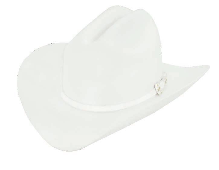 19 10X JERARCA | MF1065JERA COLORS AVAILABLE: BLACK, BELLY, PLATINUM, WHITE BRIM/FLANGE: 4”/21 100% FUR FELT SIZES: 6 3/4” - 7 5/8” LEATHER SWEATBAND BLACK WHITE BELLY 10X COLLECTION