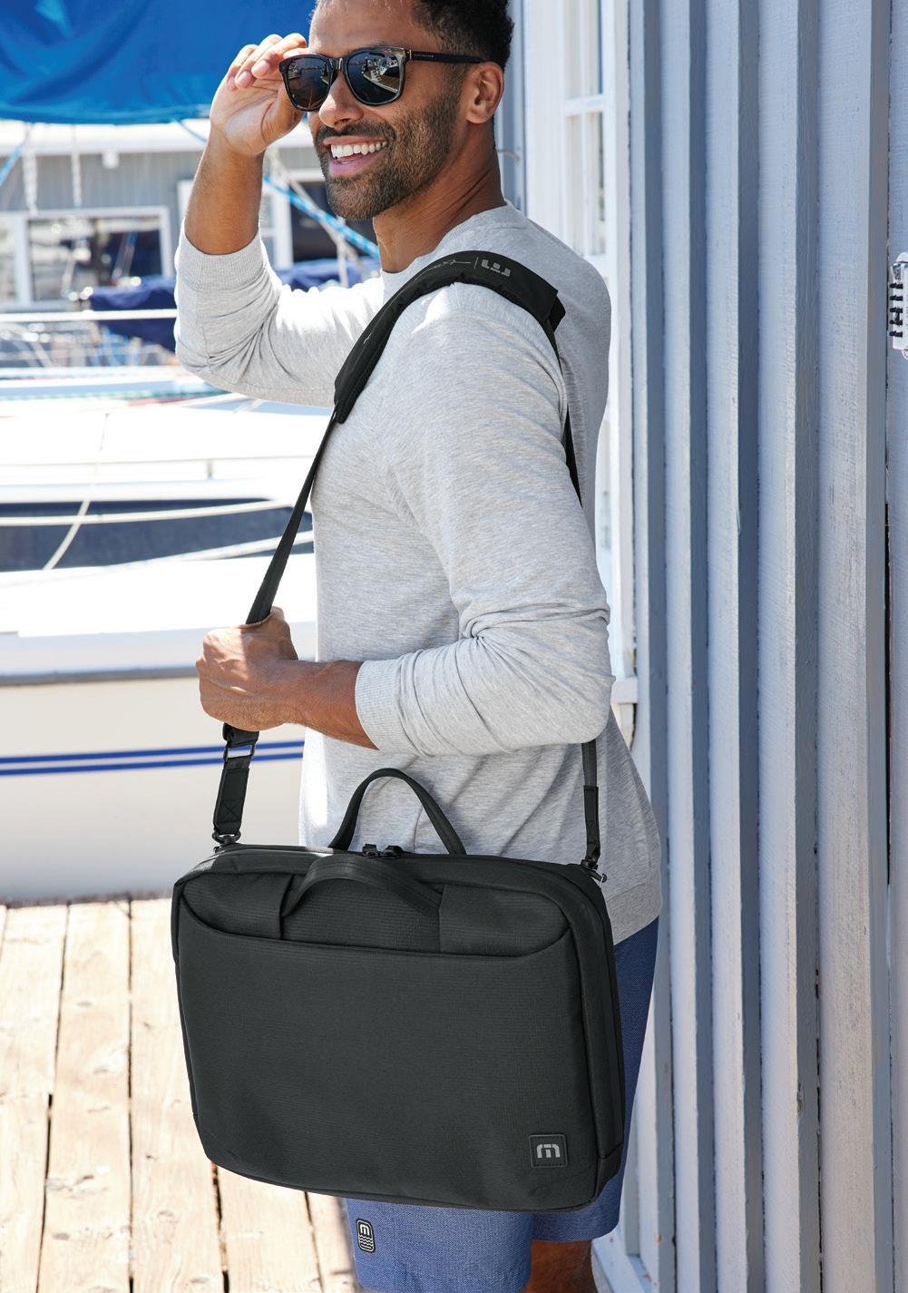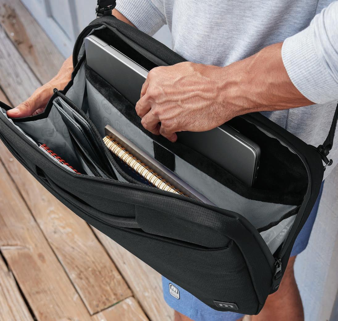 A cross between a slim brief and a messenger, this multifunctional wonder has plenty of room for your laptop and work essentials.