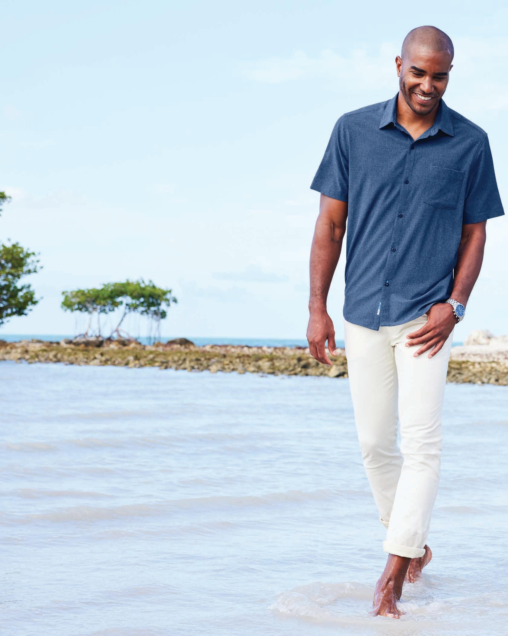 Remember that long weekend feeling any day of the week in this versatile, comfortable V-neck that can be worn at work or while hanging out.