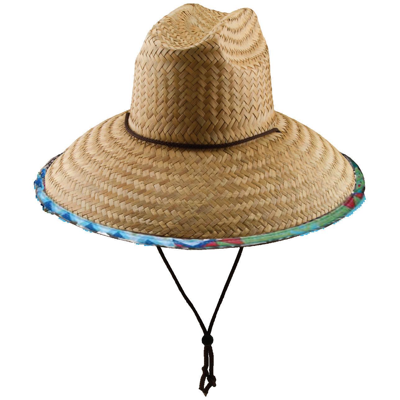 PALM LEAF LIFEGUARD WITH BOUND 4 1/2” BRIM PRINT UNDERBRIM, CHIN CORD ELASTICIZED SWEATBAND