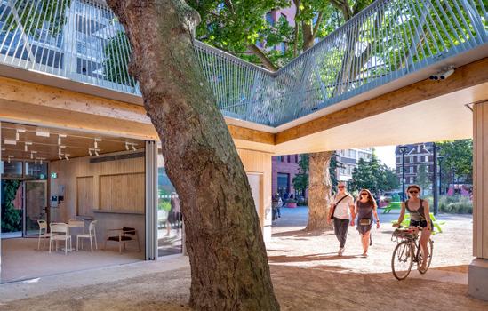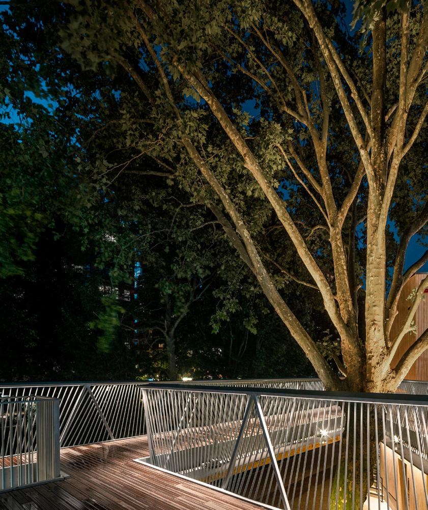 By using these lightweight materials, the structure minimizes its physical impact on the adjacent trees and their root systems. The park’s trees are a constant in the evolving context of the urban site, and they’re an important asset, providing character, biodiversity, and shade. The architects wanted to celebrate the trees within and around the pavilion, allowing visitors to experience them in a different way.