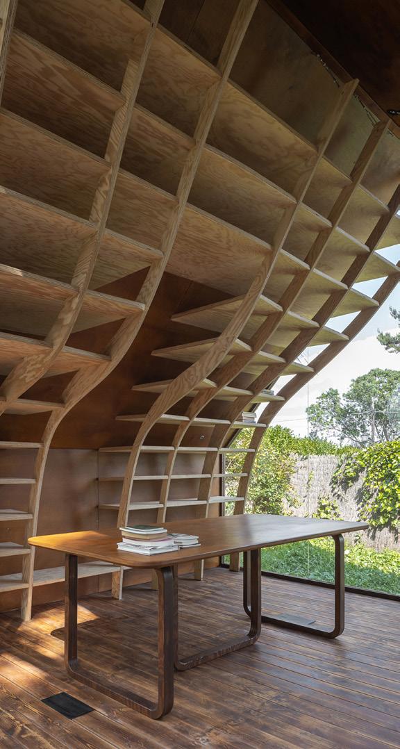 The shelves comprise 100 different pieces cut with CNC, and they were left untreated on purpose, providing a keen contrast with the maple cladding panels inside.