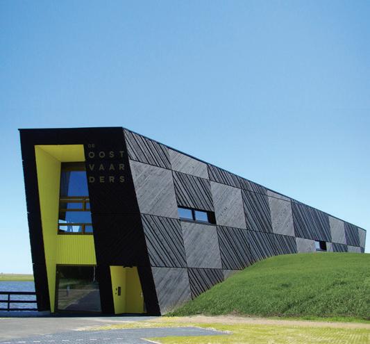 As shown in this example, the building is clad externally in a combination of horizontal tongue and groove, charred white cedar siding, and fiber cement panels, complemented by glazed aluminum-framed storefront walls and doors and insulated spandrel panels.