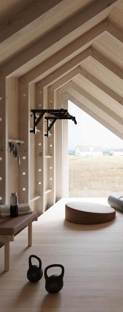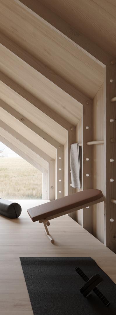 The architects—aware that peace of mind looks different for everyone—considered this aspect when designing the structure. Versatility and adaptability are integral to the design. The outer wooden structure has a simple, universal appeal, while the interior can be modified to suit individual needs and preferences. In one application, a gym; in another, a home office. Custom furniture attaches to the rungs in the interior.