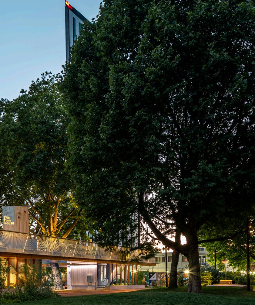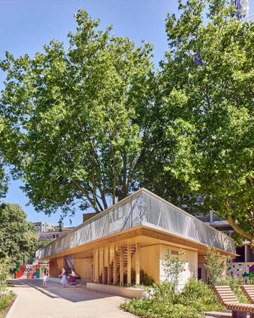 In June, the park’s pavilion was completed. Named the Tree House, the new building is designed in three sections, all connected by a roof terrace. The pavilion encircles a mature London plane tree and includes a café kiosk and a multifunctional internal space, which can be either closed off to form a contained room or opened up to the wider park setting. The roof terrace acts as a viewing gallery where visitors can look out onto the park below.