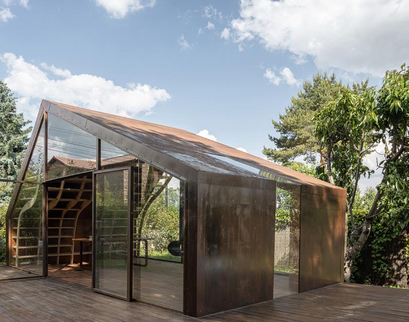 The envelope of the house roof is made of folded oxidated iron. The most challenging part of the structure was the complex curvy bookshelves—made of locally sourced pine— which were adapted to fit the cabin’s high sloped roof.