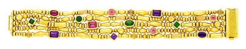 18 kt., 22 round and oval citrines, amethysts, peridots, pink tourmalines and blue topaz ap. 43.90 cts., 12 small round diamonds, ap. 17.2 dwts.