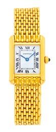 18 kt., quartz, square silver-tone dial, black Roman numerals, stepped diamond-set bezel and lugs, inverted diamond crown, diameter ap. 30 x 22 mm., five-row bar link bracelet with double deployant clasp, signed Cartier, case no. MG377070, ap. 41.2 dwts. gross. Length 5 7/8 inches. With signed case and box.