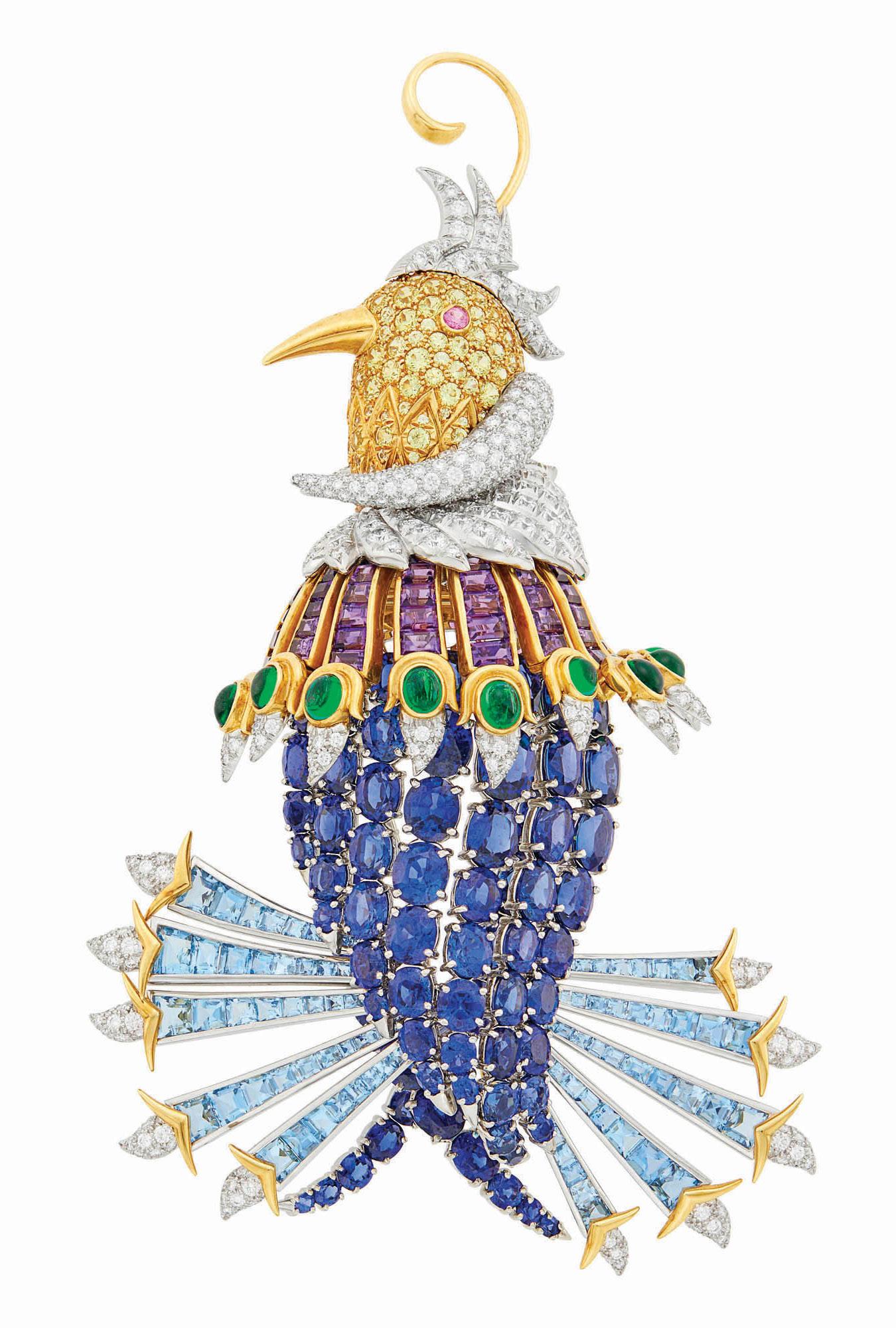 Left: Tiffany & Co., Schlumberger Gold, Platinum, Gem-Set and Diamond ‘Oiseau de Paradis’ Clip-Brooch Est. $100,000 – 200,000 Auction Oct 26