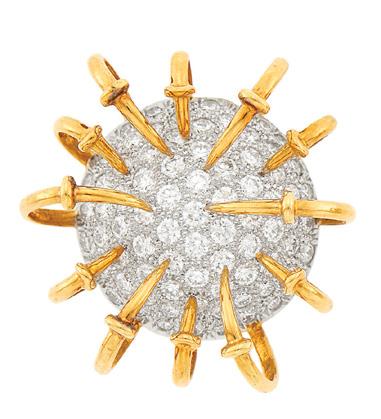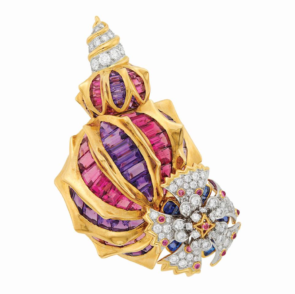Bottom Right: Tiffany & Co., Schlumberger Gold, Platinum, Gem-Set and Diamond Shell Clip-Brooch, France Est. $20,000 – 30,000 Auction Oct 26