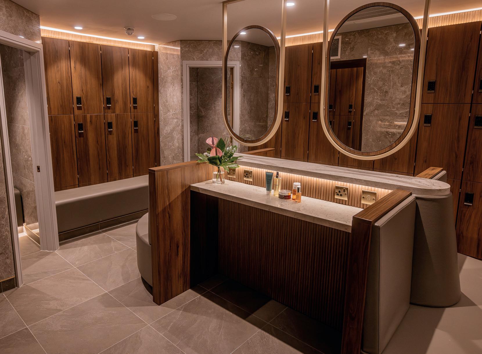 gold and black tones. Additional facilities include an outdoor hydrotherapy pool, ice fountain, sensory showers, and a cold plunge pool for contrast therapy.