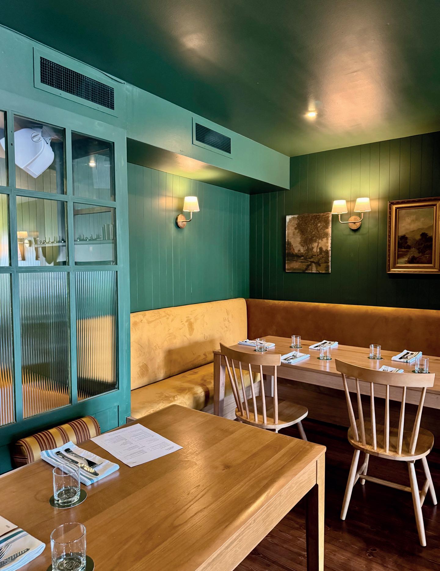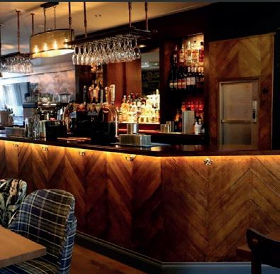 in upcycled wood from a former floor to create a striking chevron finish. This detail blends seamlessly into the timber flooring, adding a rustic element and shaping a convivial heart for the venue. The interior colour palette leans into deep greens, muted blues, and rich wooden textures, creating a comfortable and inviting space. Rather than relying on clichéd ‘Highland’ décor, it draws on refined cues to evoke Scottish heritage in a tasteful and contemporary way.
