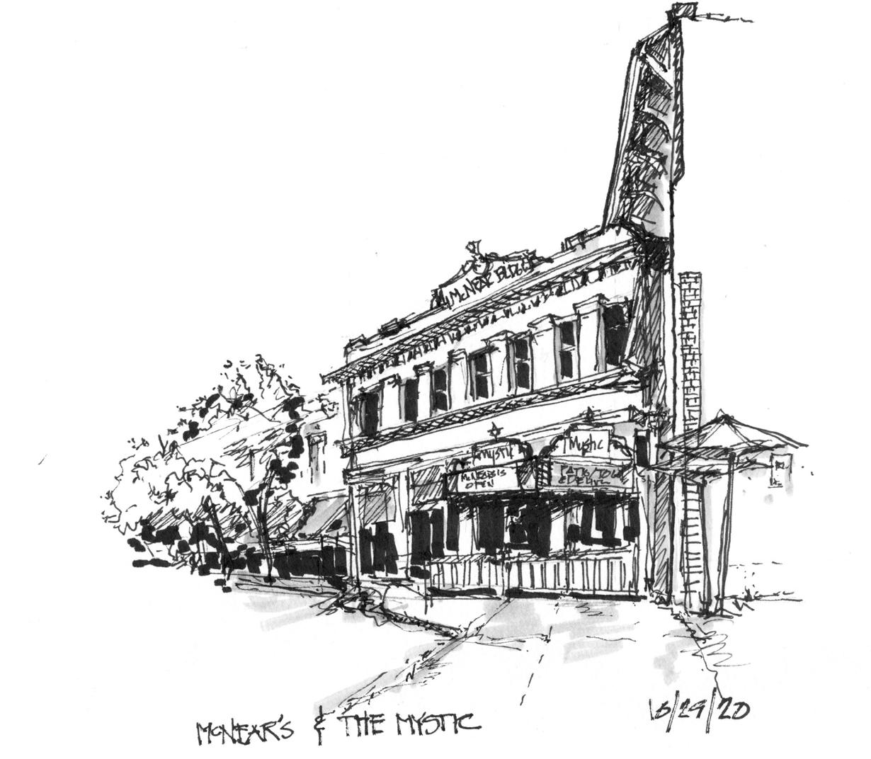 The Petaluma River, which flows through the California counties of Sonoma and Marin, is 15 miles from Alan’s home. As the global pandemic unfolded, he found the river – a tidal slough for most of its length – a safe, pleasant location to sketch. As a former architect, he was naturally attracted by the large feed mill buildings, housing, and commercial and industrial buildings along its shores.