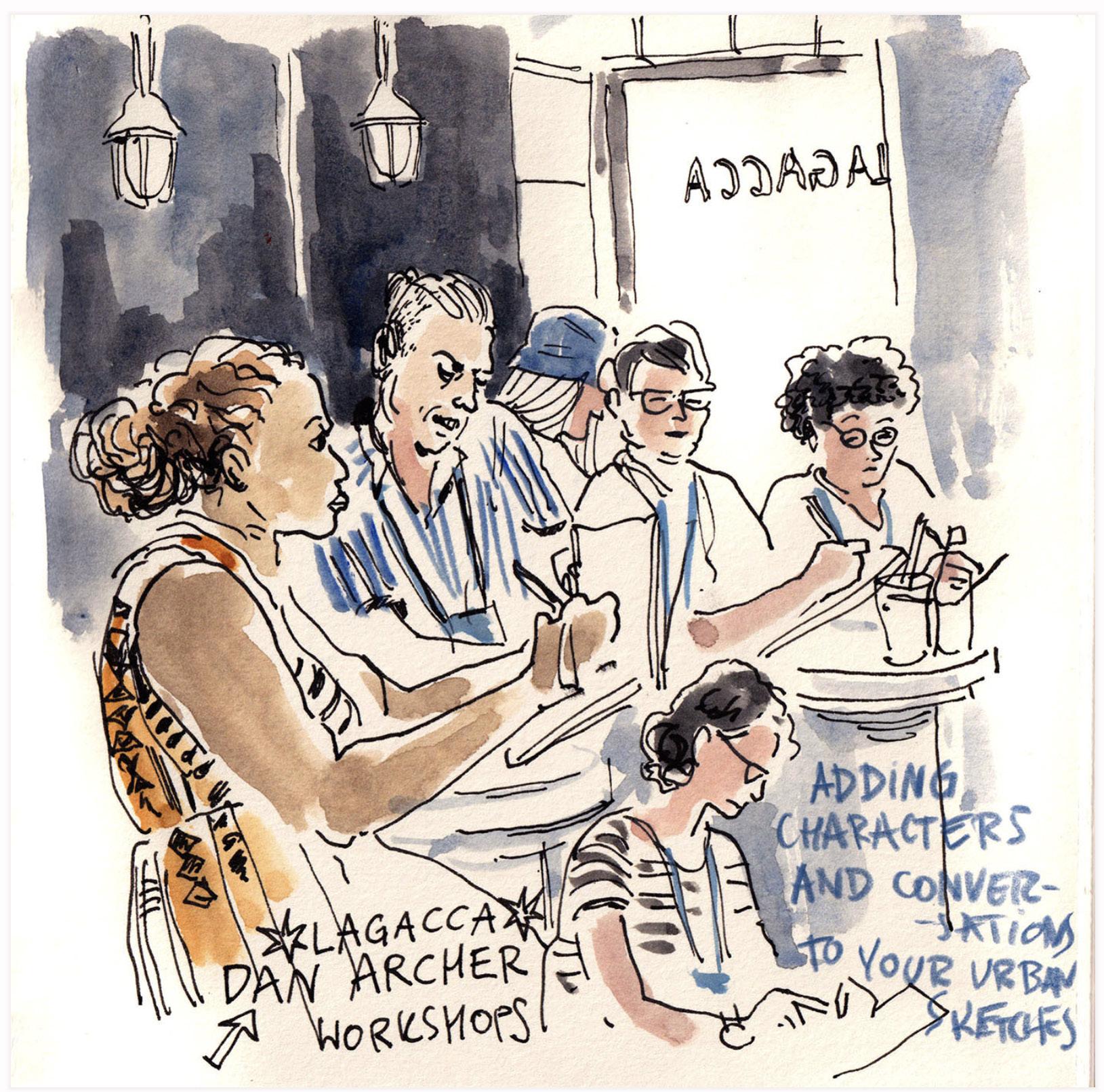 ABOVE: A SKETCH OF DAN ARCHER’S WORKSHOP ‘ADDING CHARACTERS AND CONVERSATIONS TO YOUR URBAN SKETCHES’ ON DAY 2 OF THE POZNAŃ SYMPOSIUM, BY SYMPOSIUM CORRESPONDENT ANKA ZIĘTKIEWICZ. “IT WAS A SURPRISING WORKSHOP WITH A RAPPING CAFÉ OWNER,” SAID ANKA.