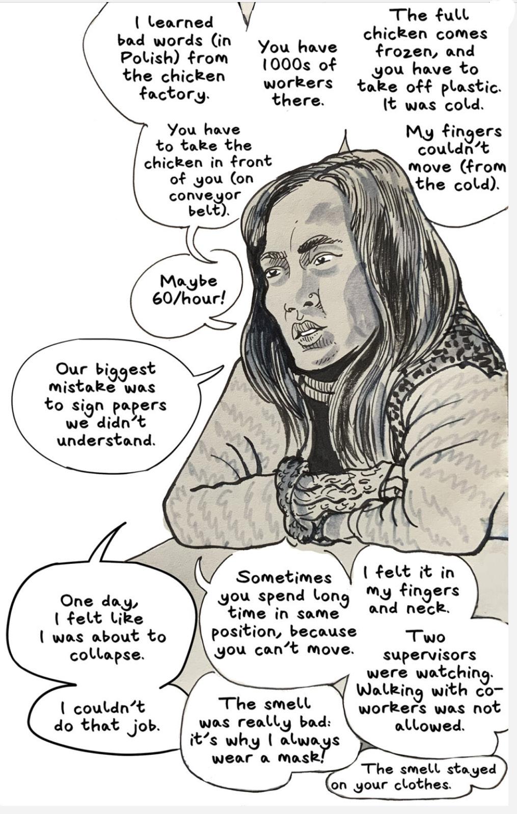 Dan focuses on people, their stories, and the environment they are in. This works well with his love for drawing as a way of connecting with strangers. His many projects have found him drawing and interviewing people in refugee camps, homeless shelters, on the factory floor, and alongside child laborers. He says drawing helps him build trust with his subjects, as a sketched portrait protects a person’s identity better than a photograph.