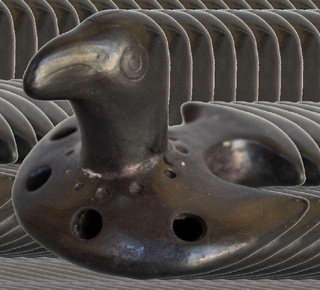 El sonido que emite es como de una flauta de pan, tanto aquí como en aquel, se trata de hacer vibrar, en el Perú, en la cultura Nazca, los silbatos de arcilla representan generalmente pájaros, están premunidosdeuntubofinoyalargadoparaconducirelsoplido.