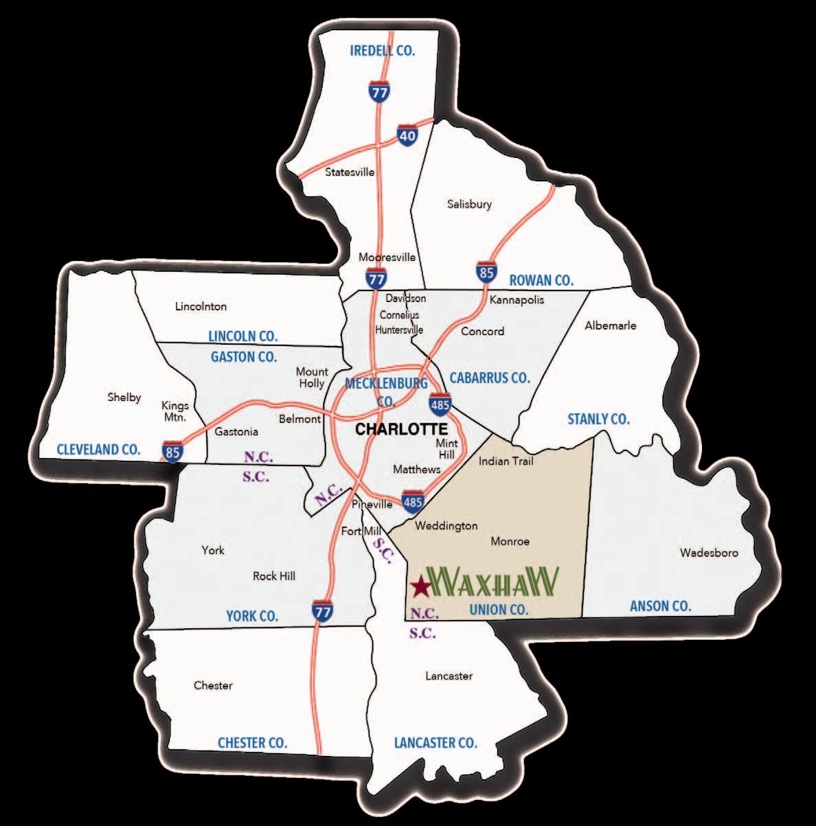 Within 20 miles of the bustling city of Charlotte, Waxhaw is located on the southwest corner of Union County in North Carolina and very close to the border of South Carolina. Surrounding communities include Marvin, Monroe, Mineral Springs, and Wesley Chapel.