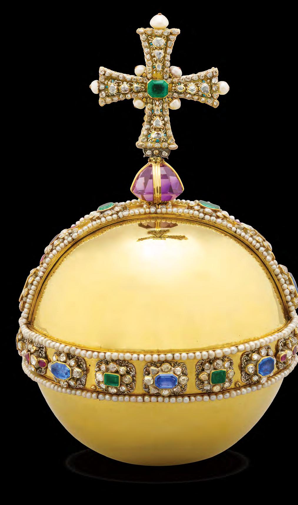 During the coronation, a hollow golden orb is placed in the right hand of the new monarch. A type of globus cruciger, the Sovereign’s Orb represents the sovereign’s power and is meant to remind the monarch that their power is derived from God. It is topped with a cross set with pearls, diamonds, a sapphire and an emerald. Bands of diamonds, sapphires, rubies and pearls divide the globe into three sections to represent the three known conti nents at the time it was designed by Sir Robert Vyner, the royal goldsmith, in 1661.